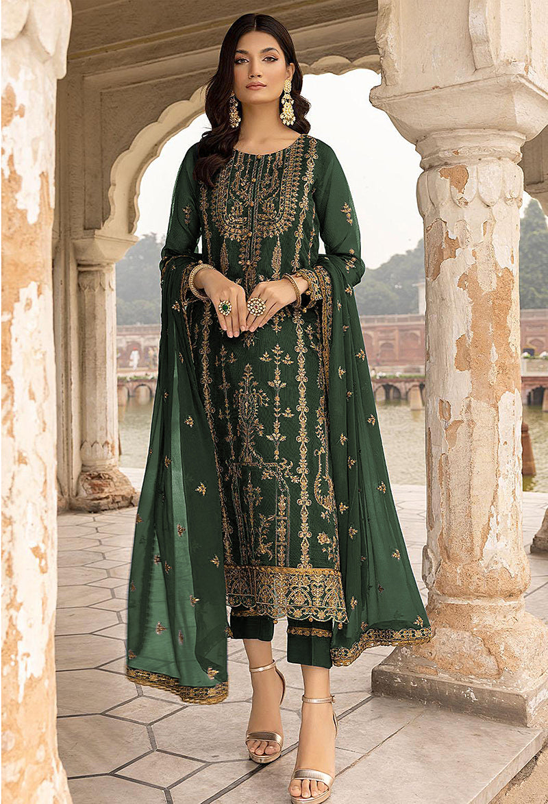 Women's Embroidered Faux Georgette Pakistani Suit In Dark Green