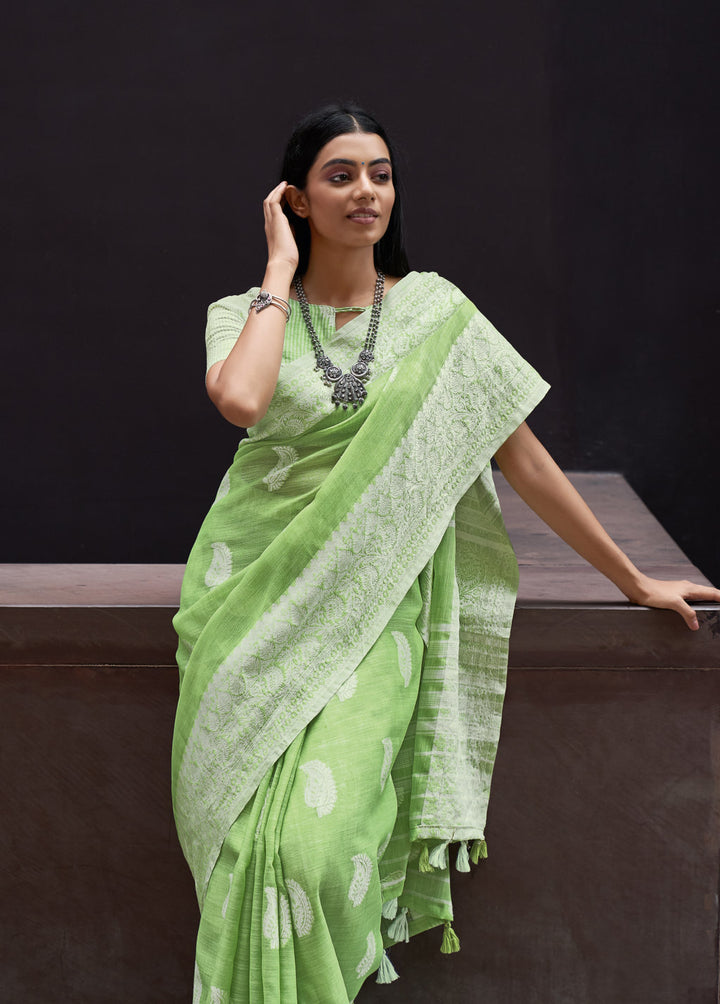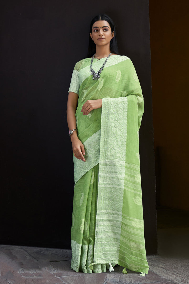 Women's Sangam Prints Light Green Linen Thread Work Traditional Tassle saree