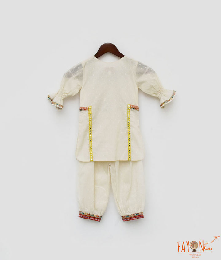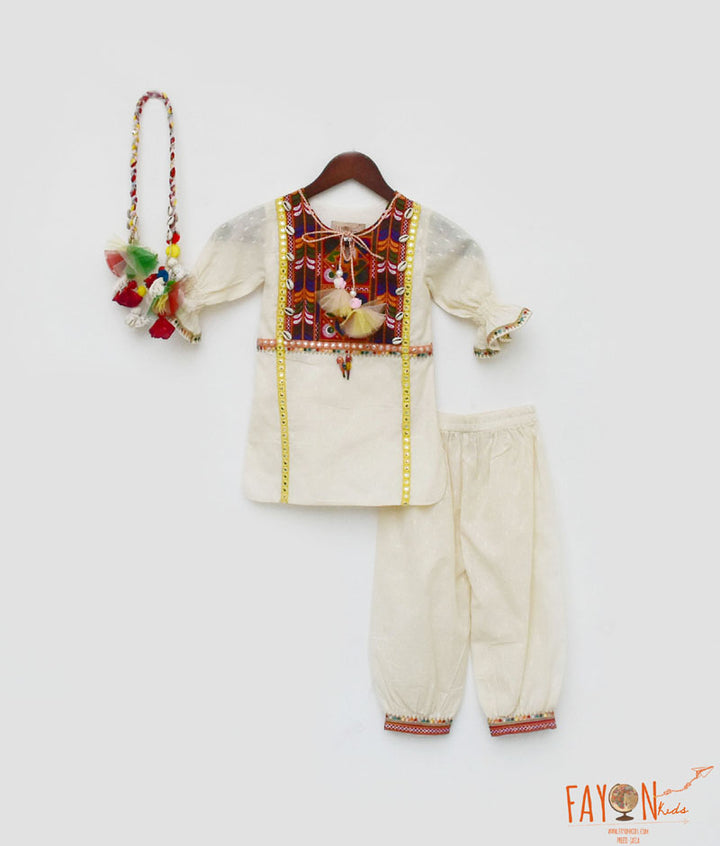*Self Cotton Kurti With Cotton Base Lining *Round Neck And Dori Tassels *3/4 Bell Sleeves *Finishing Laces In All Over Kurti *Shells Attached On Yoke *Salwar Without Cotton Lining *Print Border Finishing And Lace In Bottom Salwar
