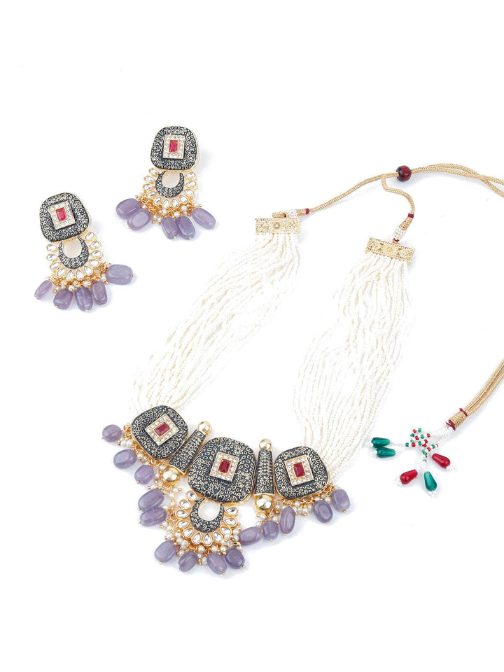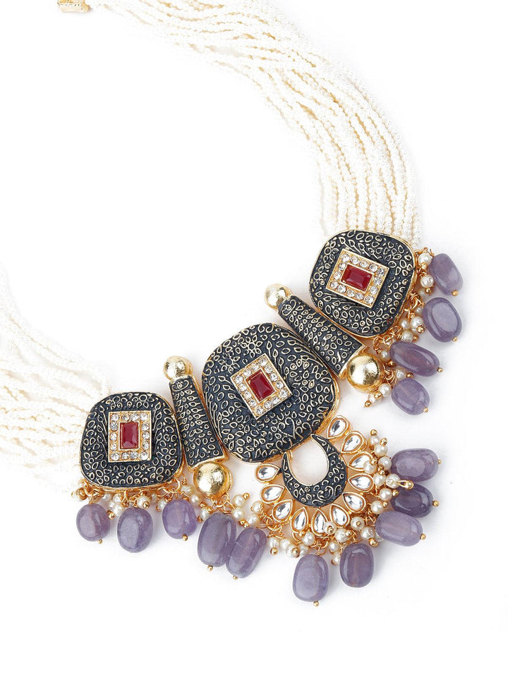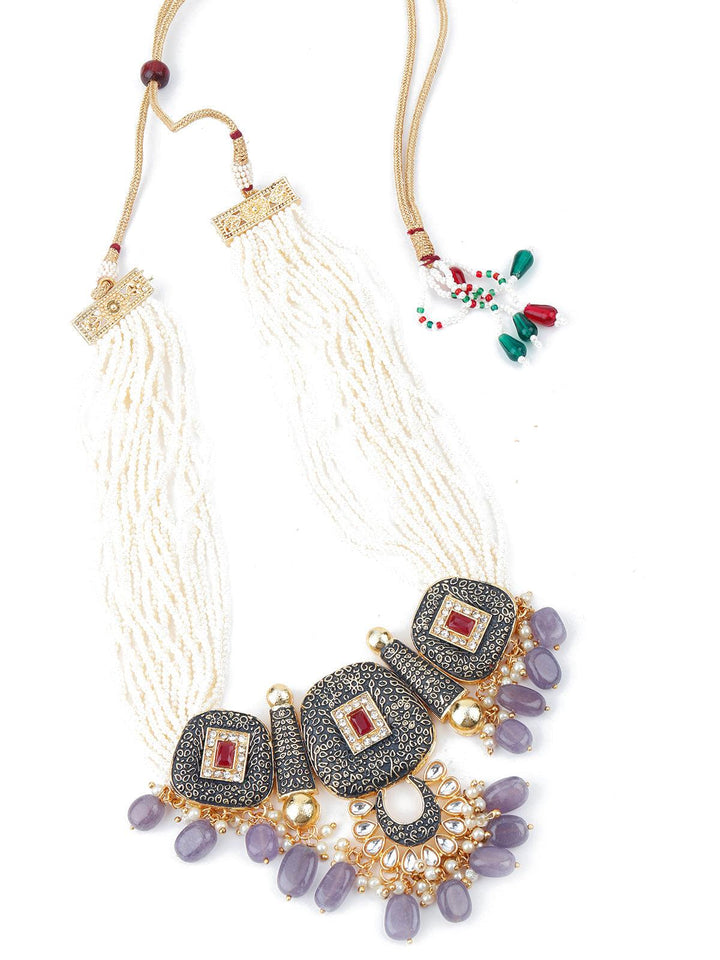 - Multi-stranded necklace has three engraved linking segment as pendant decorated with kundan and mani.