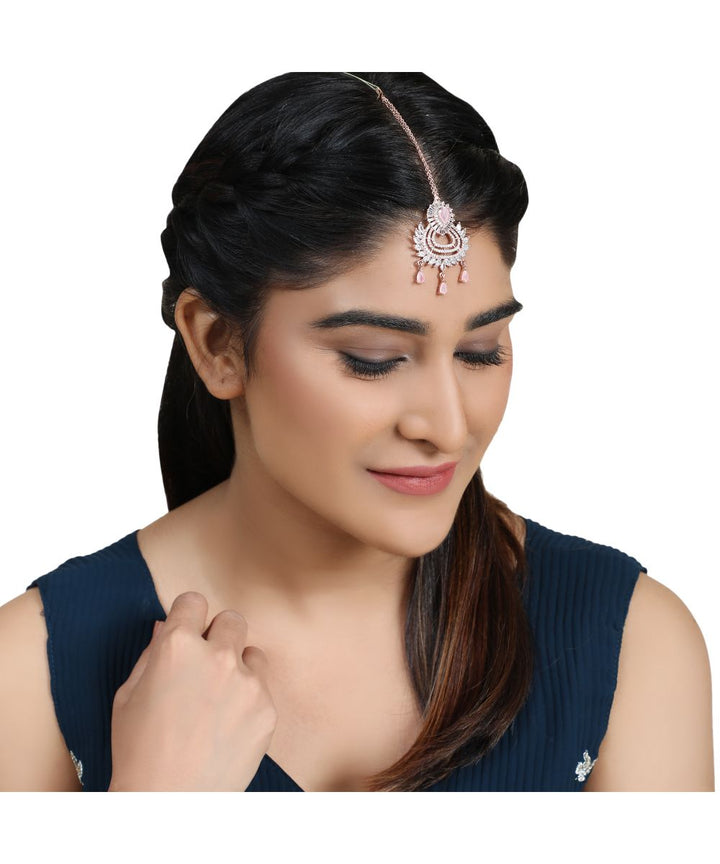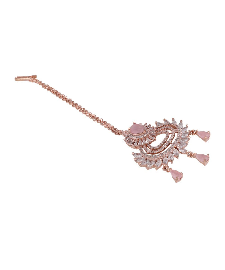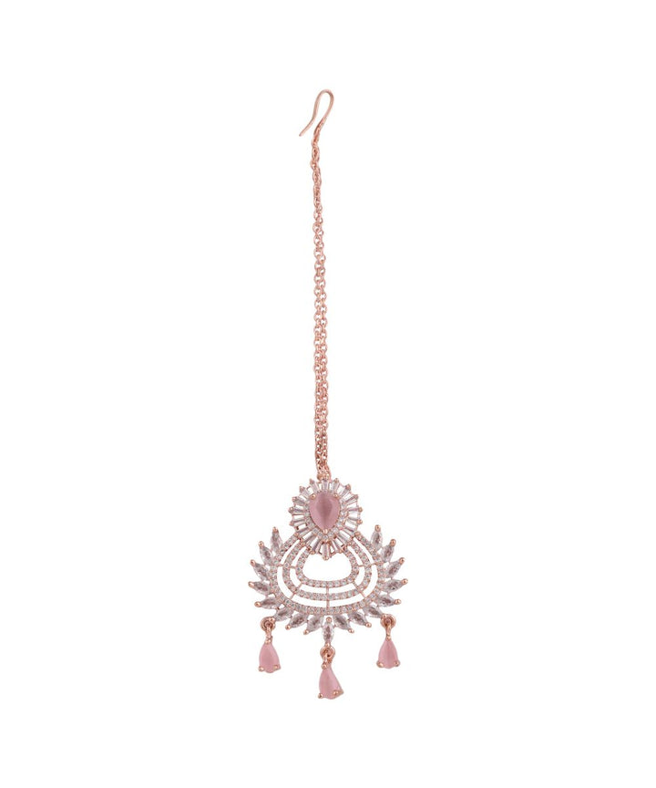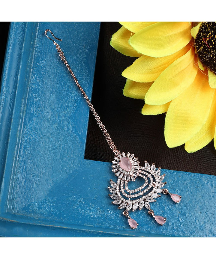 Rose Gold Plated American Diamond studded Pink colored stone Statement Maang-tikka for Girls and Women, Ideal gift for someone you LOVE. Use it for Mother's Day, Eid , Birthday, Anniversary, Festive.