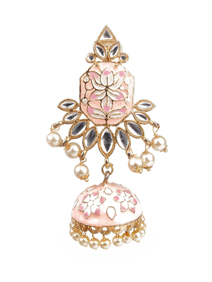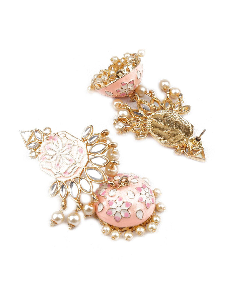 This stylish pair of peach, white and gold dangler jhumki earring is an interesting piece. It is a perfect accompaniment to party/ wedding outfits and goes well with Indian and Indo-western dressing.