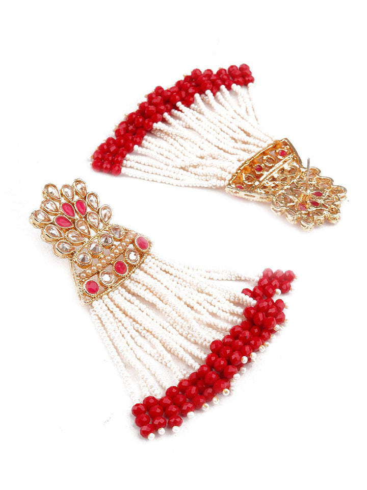 This stylish pair of red and gold jhumki dangle earring is an interesting piece. It is a perfect accompaniment to party/ wedding outfits and goes well with Indian and Indo-western dressing.