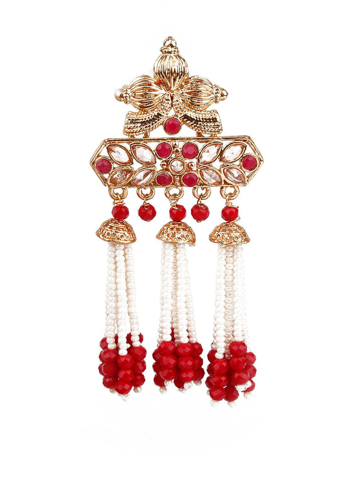 This stylish pair of red and gold dangler earring is an interesting piece. It is a perfect accompaniment to party/ wedding outfits and goes well with Indian and Indo-western dressing.