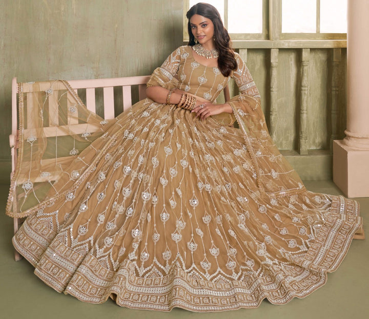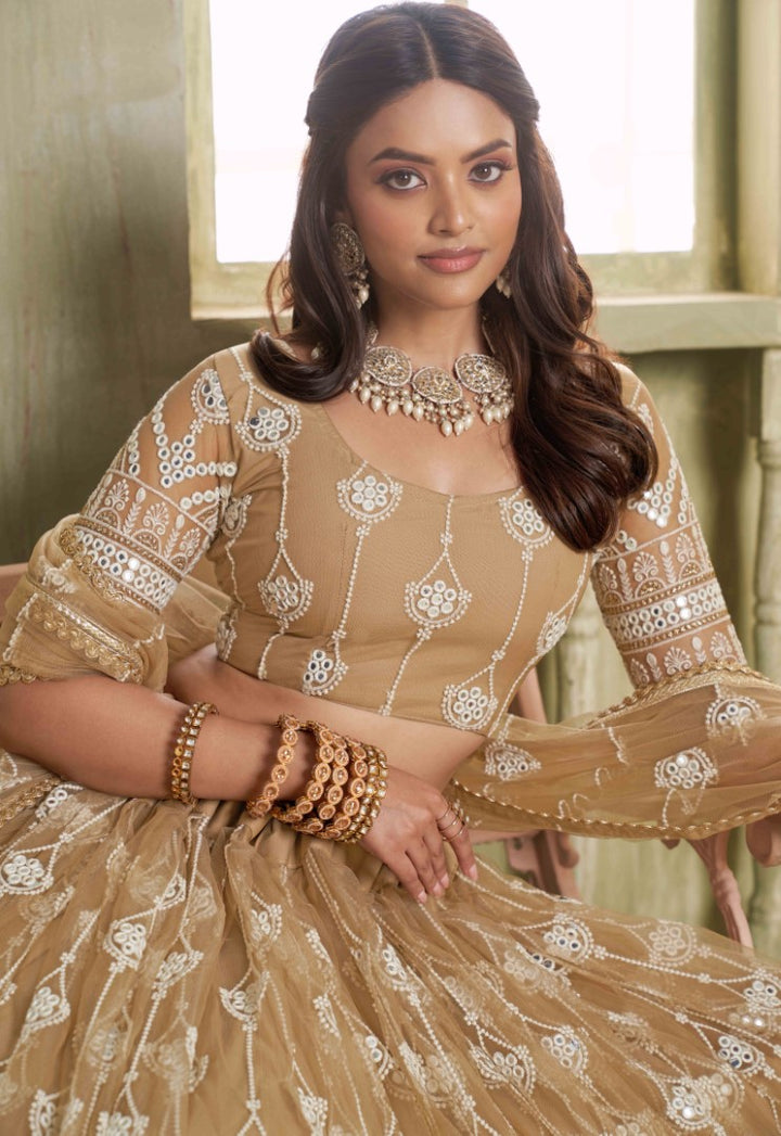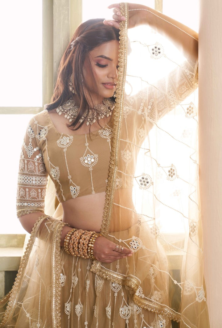 Beige Embroidered Net Semi Stitched Lehenga Choli Wedding & Party Wear Chaniya Choli For Women