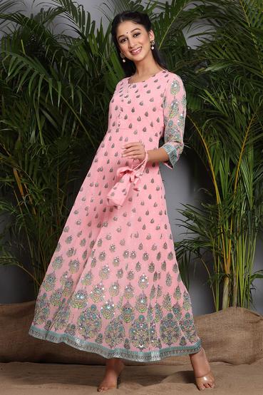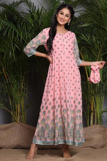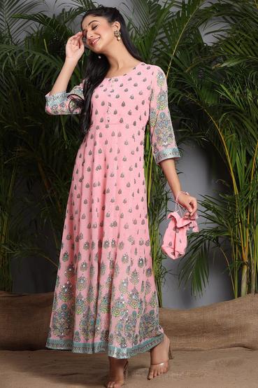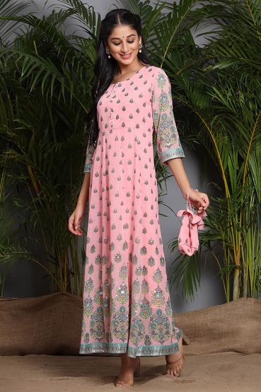 Description :Juniper Pink Georgette Printed Flared DressColor :PINKFabric :GeorgettePrint :PrintedPrint & Pattern Type :Ethnic MotifsHemline :FlaredSleeve Length (Inches) :16Sleeve :Three-Quarter SleevesSleeve Styling :Regular SleevesLength type :Ankle LengthLength (Inches) :52Neck :Round NeckShape :FlaredOrnamentation :Placement PrintSurface styling :NAClosure :Concealed ZipMaterial Transperency :OpaqueOccasion :FestiveWash care :Hand Wash