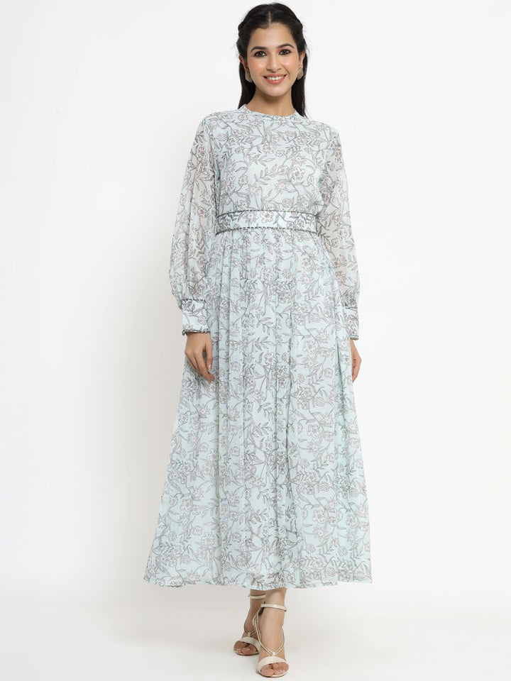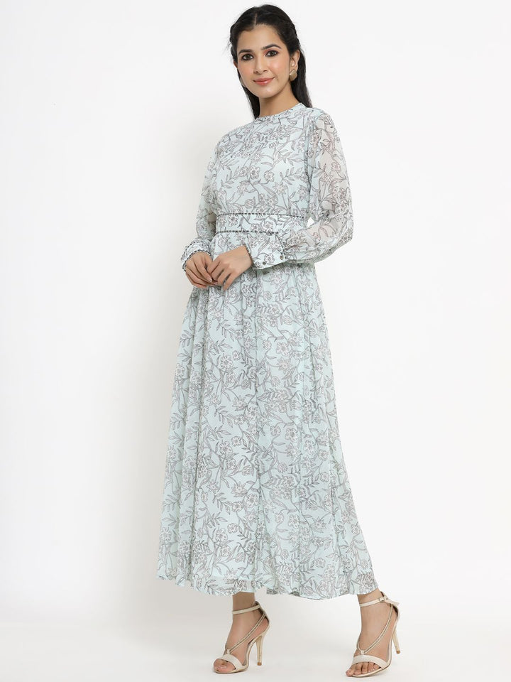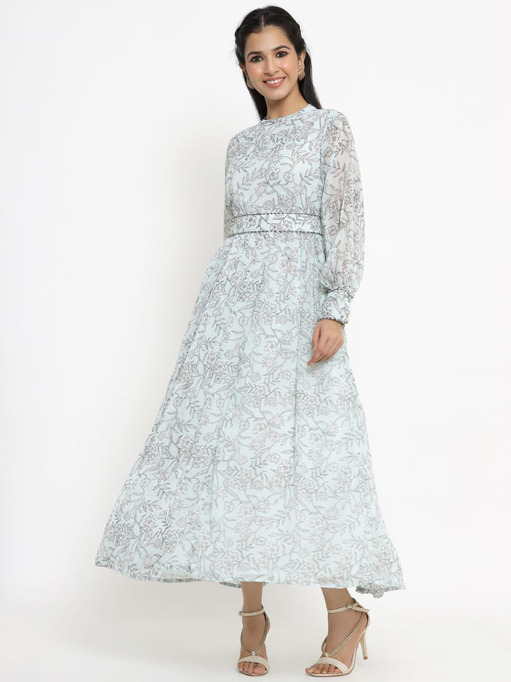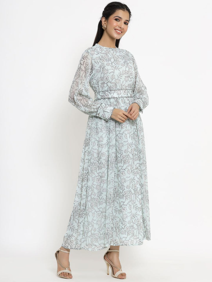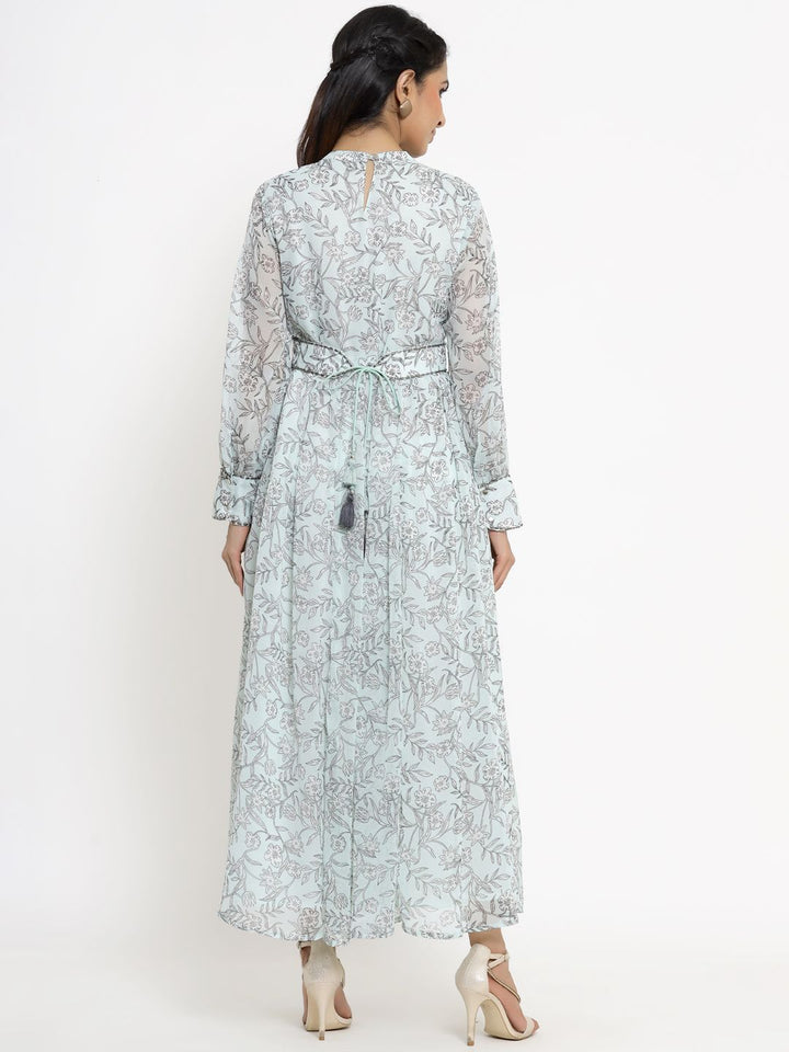 Women's Sagegreen Alphin Chiffon Flared Printed Dress With Tie-up Blet