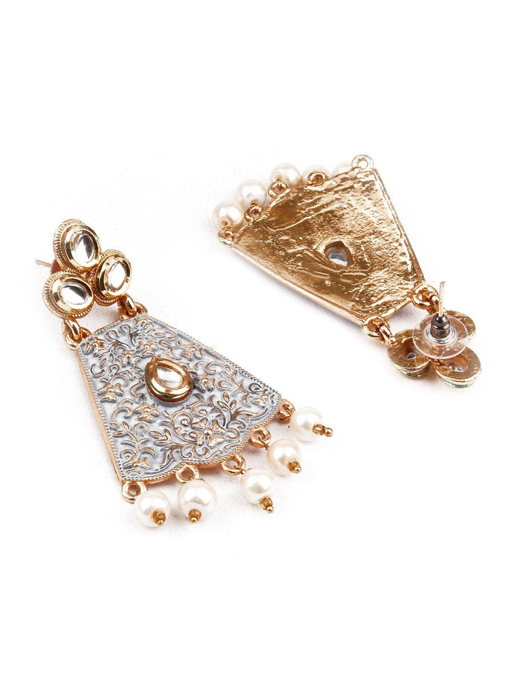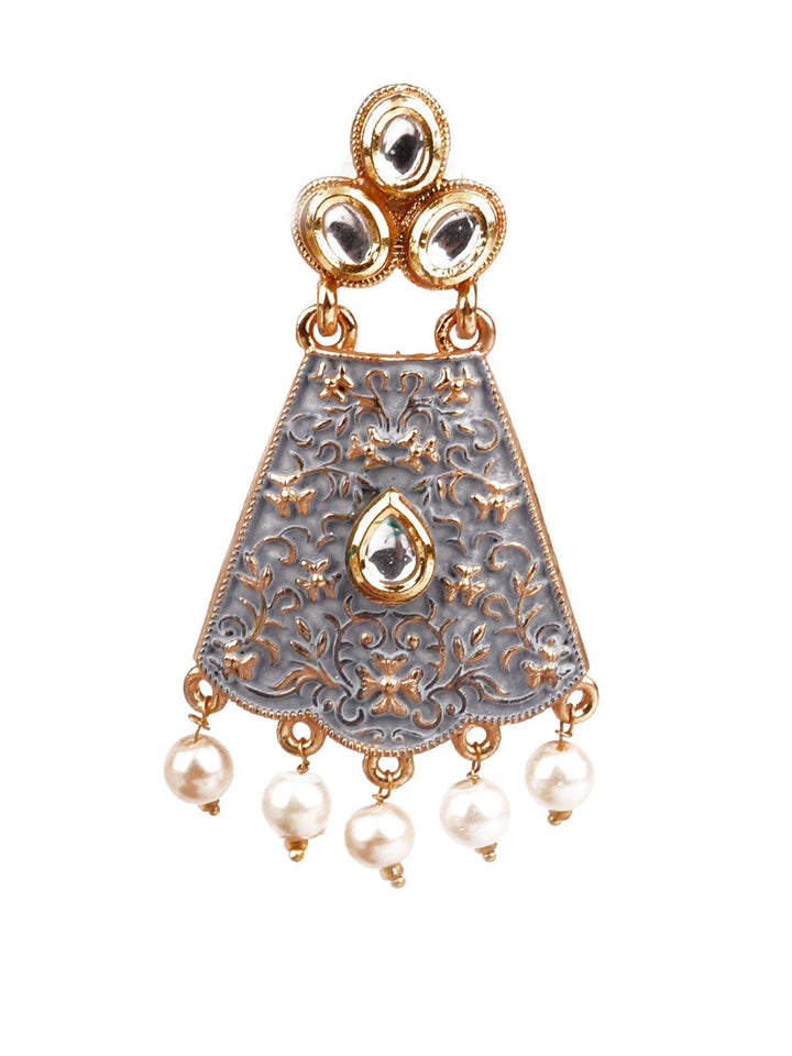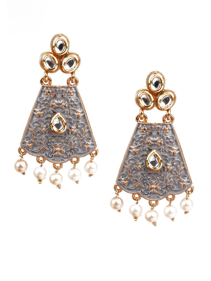 This stylish pair of grey and gold dangler earring is an interesting piece. It is a perfect accompaniment to party/ wedding outfits and goes well with Indian and Indo-western dressing.