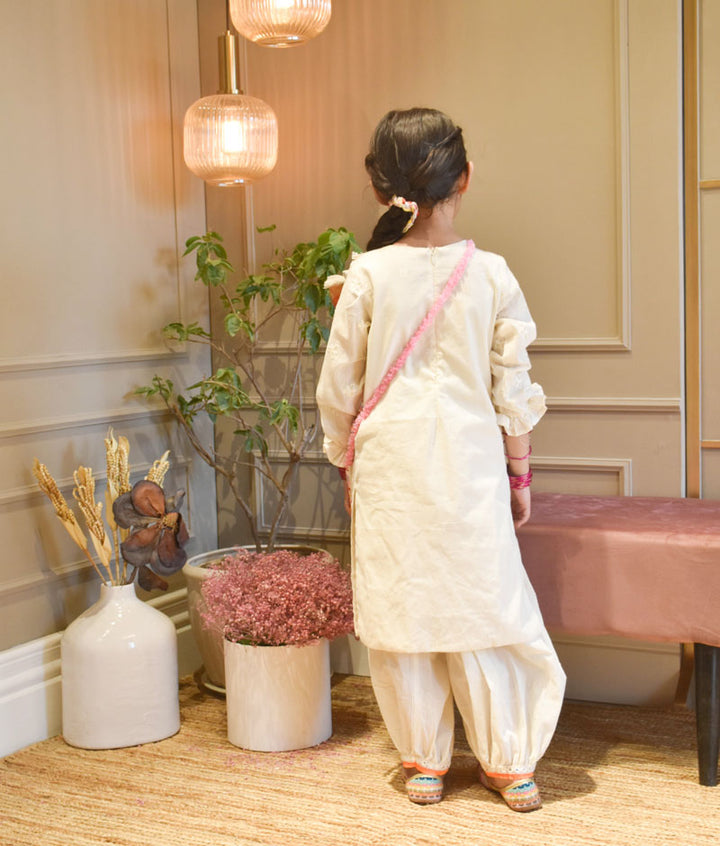 *Self Embroidery Kurta With Cotton Base Lining *Jacket Attached In Front With Dori Tassels *3/4 Sleeves Without Lining *Pant Without Lining *Geathers And Mirror Finishing In Pant