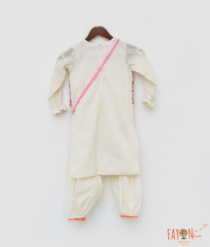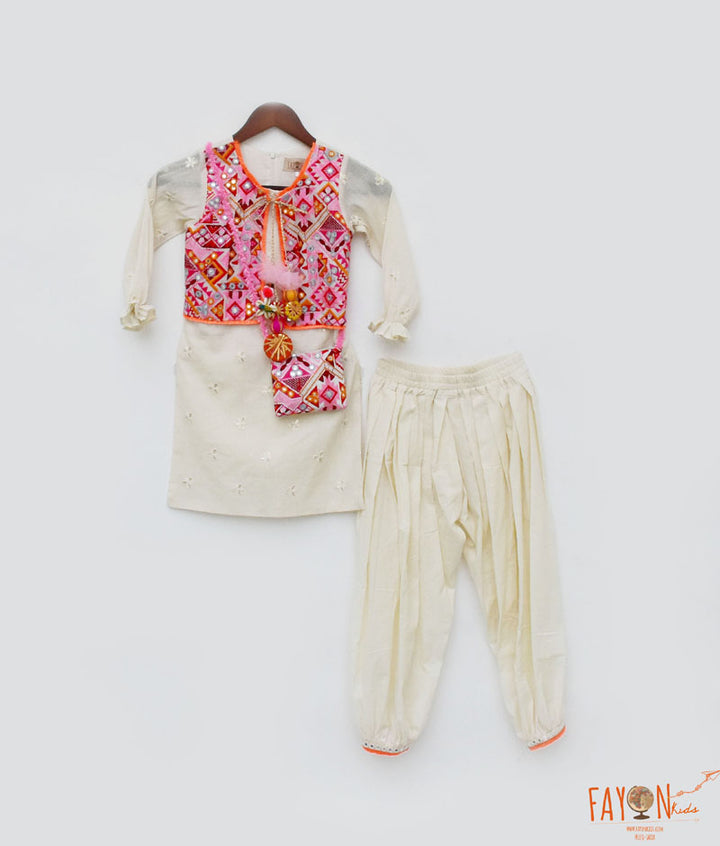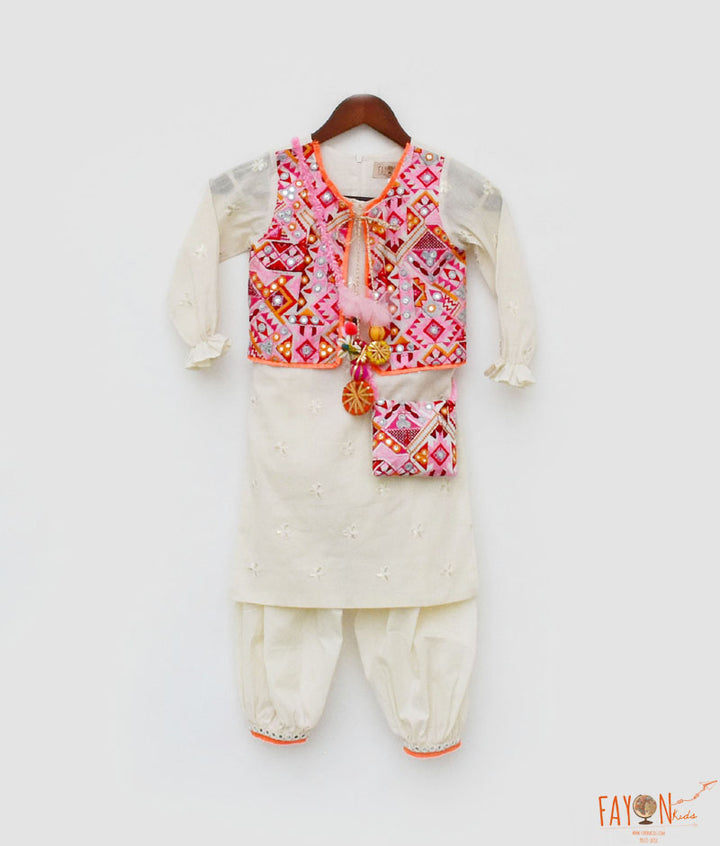 Girl's Multi Colored Embroidery Jacket And Kurti Pant