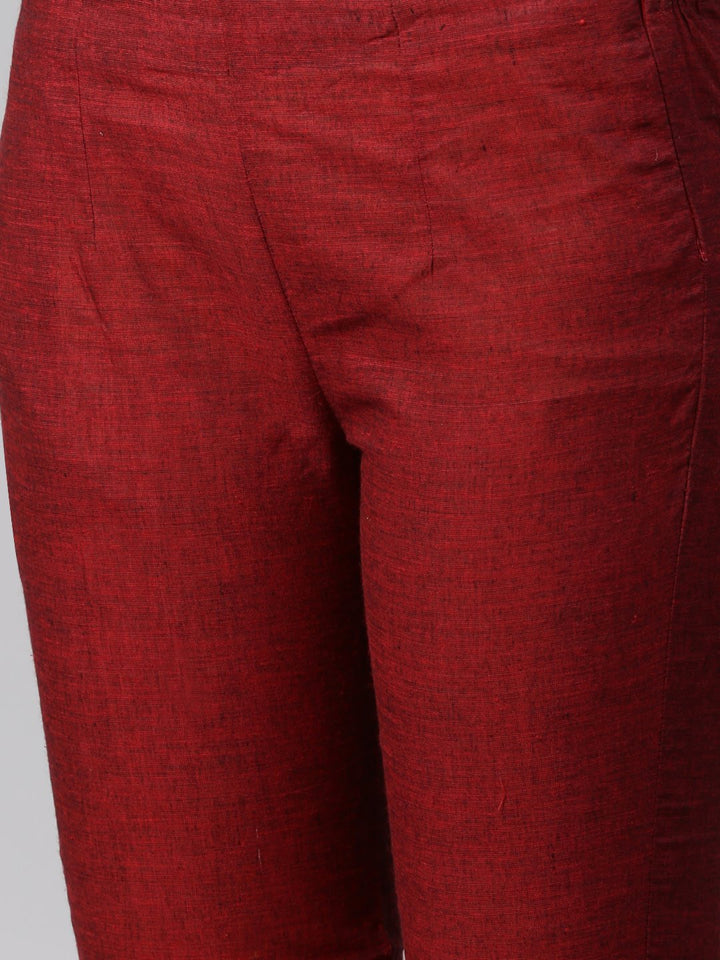 Maroon yoke design straight knee length kurta, has a round neck, three-quarter sleeves, straight hem, side slits