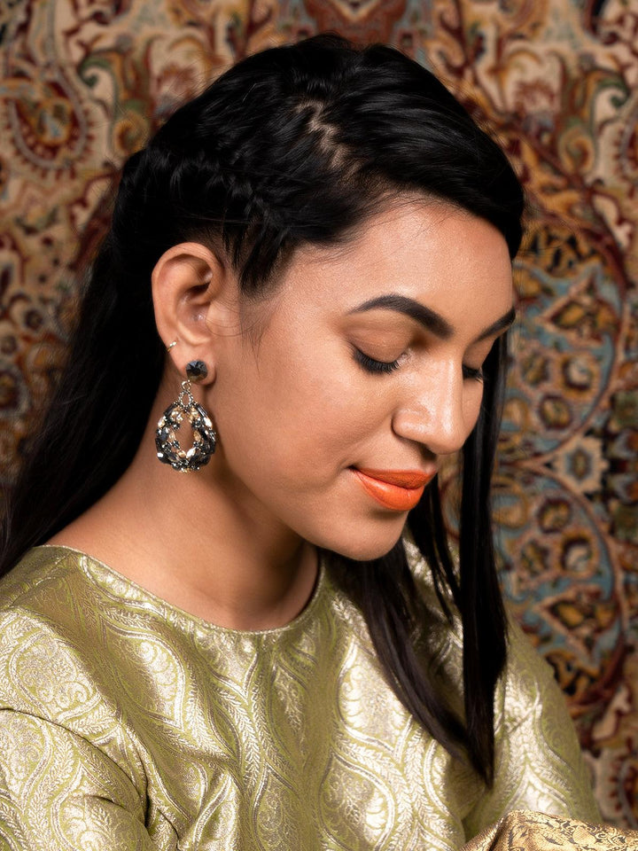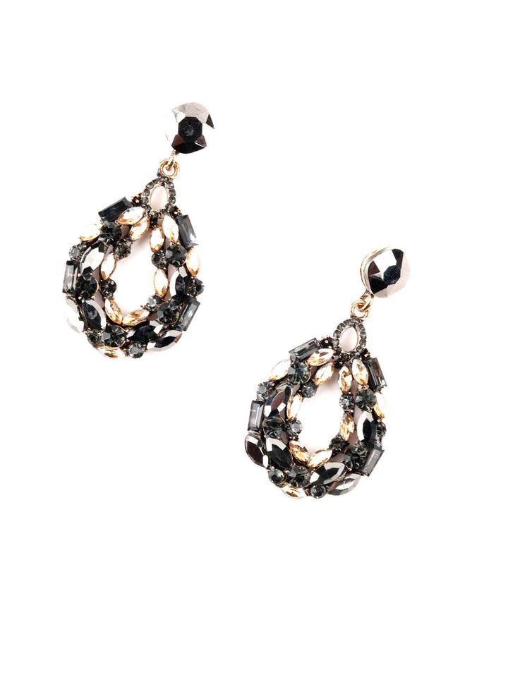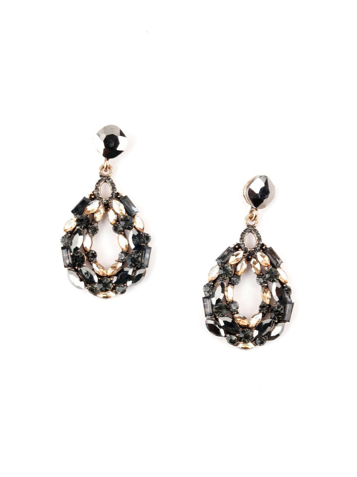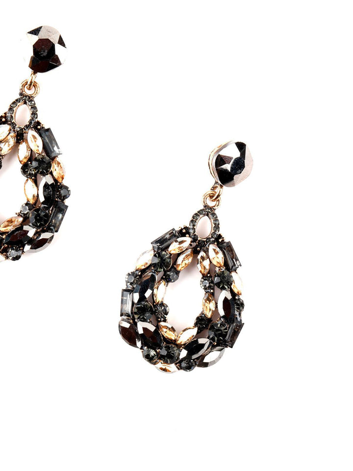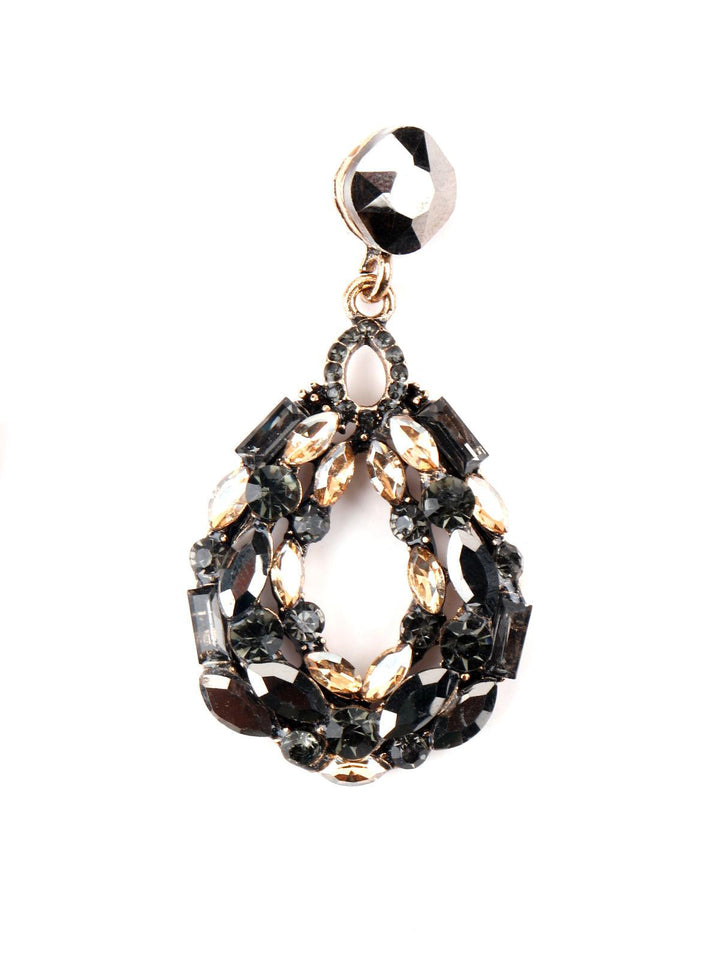 - Dangles are decorated in shiny black rhine stones.