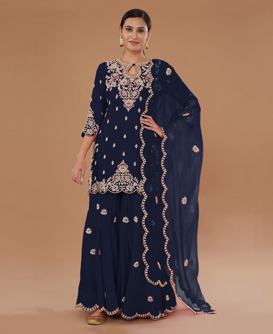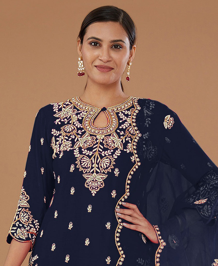 Blue Vichitra Silk Heavy Thread Sequin Embroidery Work Round Salwar Suit