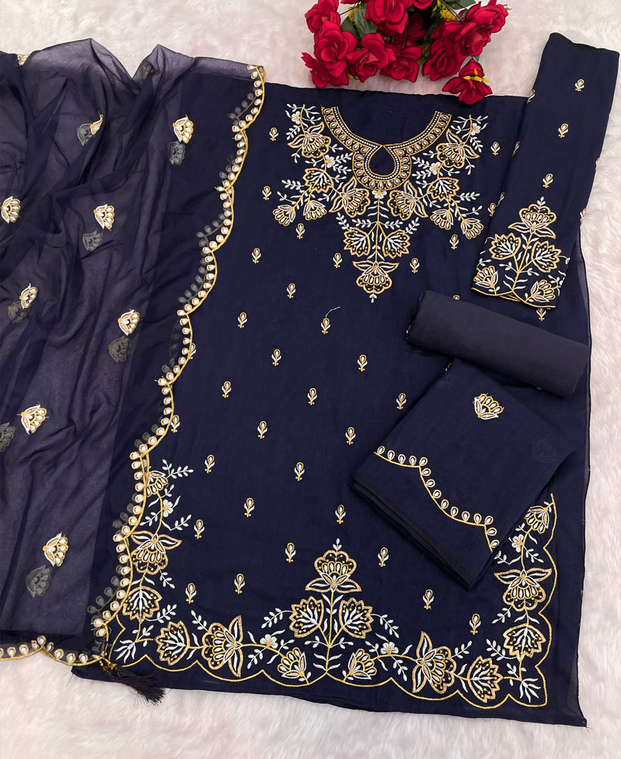 Women's Blue Vichitra Silk Heavy Thread Sequin Embroidery Work Round Stright Suit
