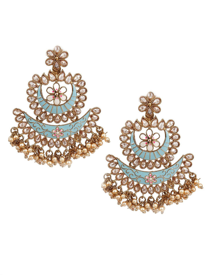 This stylish pair of blue and gold layered chandbali dangle earring is an interesting piece. It is a perfect accompaniment to party/ wedding outfits and goes well with Indian and Indo-western dressing.